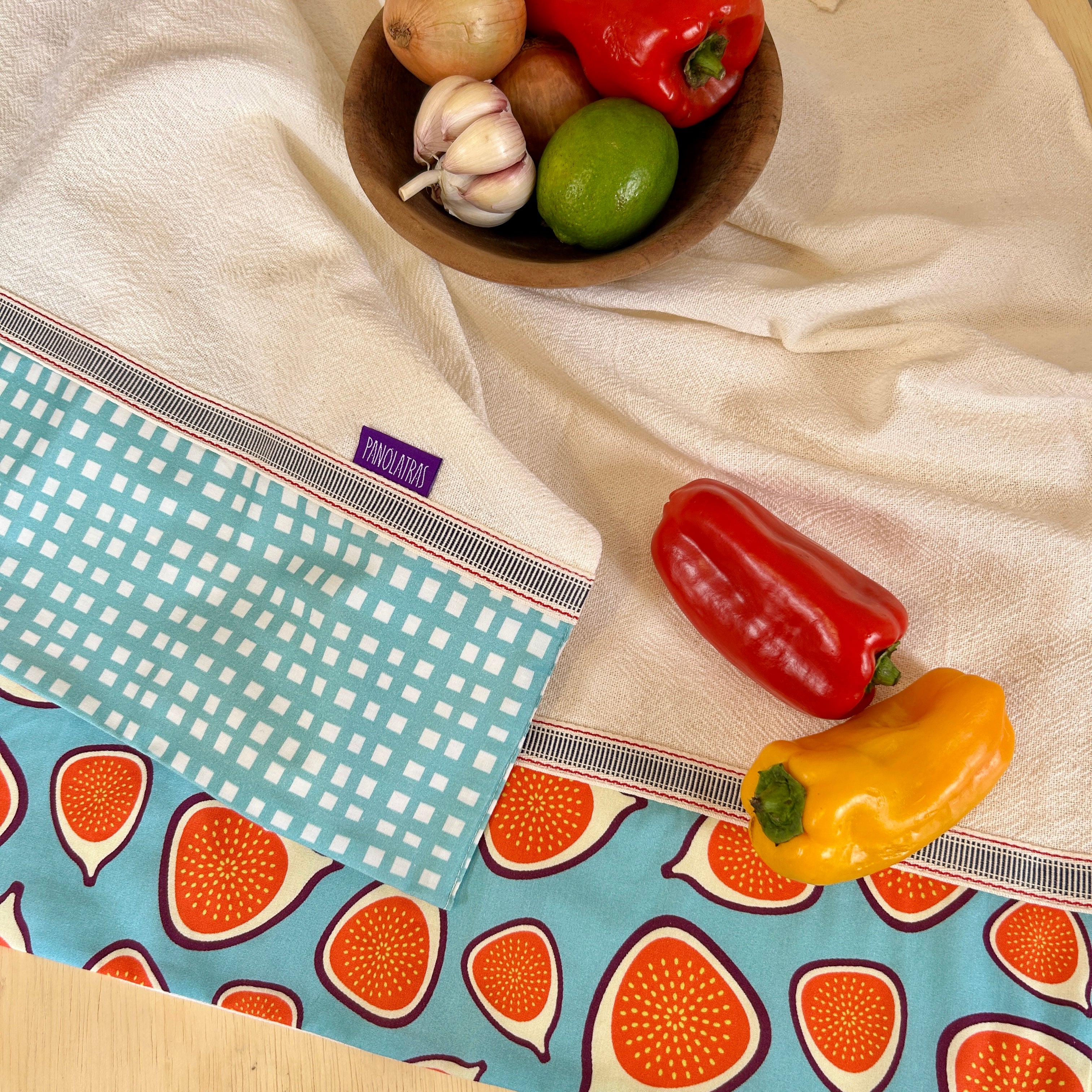 O tom cru do tecido valoriza o natural e reforça o cuidado na escolha dos materiais. O acabamento em tricoline estampada — também 100% algodão — traz cor e aquele toque moderno e estiloso à peça, com estampas Panólatras que fazem a diferença na cozinha.