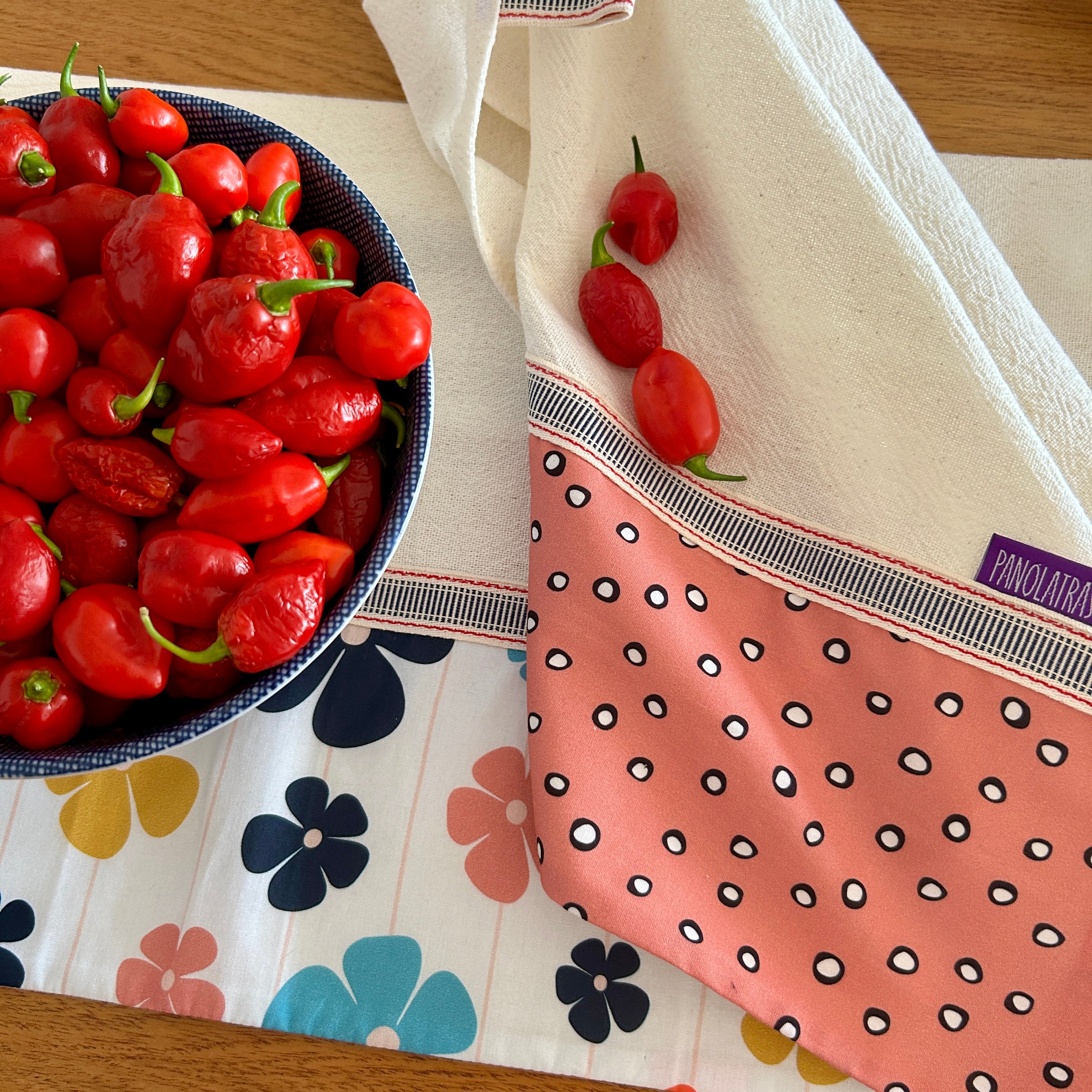 O tom cru do tecido valoriza o natural e reforça o cuidado na escolha dos materiais. O acabamento em tricoline estampada — também 100% algodão — traz cor e aquele toque moderno e estiloso à peça, com estampas Panólatras que fazem a diferença na cozinha.