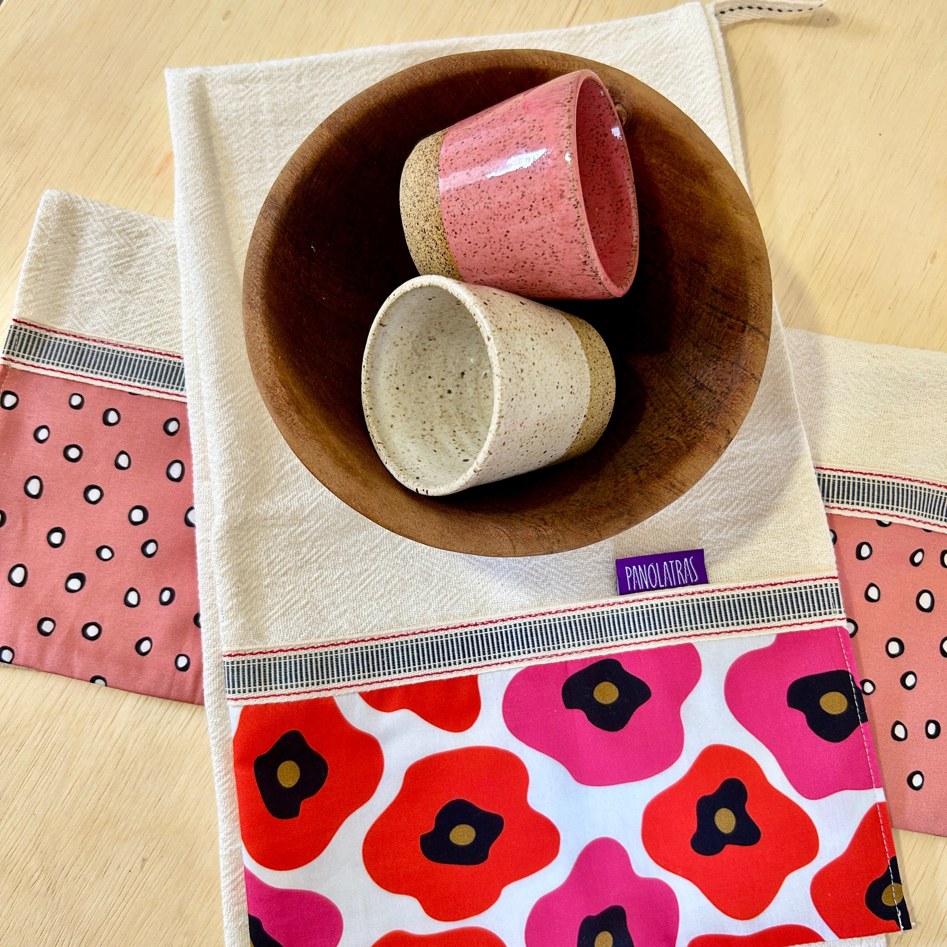 Nossos panos de prato são confeccionados artesanalmente em sacaria premium 100% algodão (trama tipo “pé de galinha”), que garante alta absorção, toque macio e resistência no uso diário.