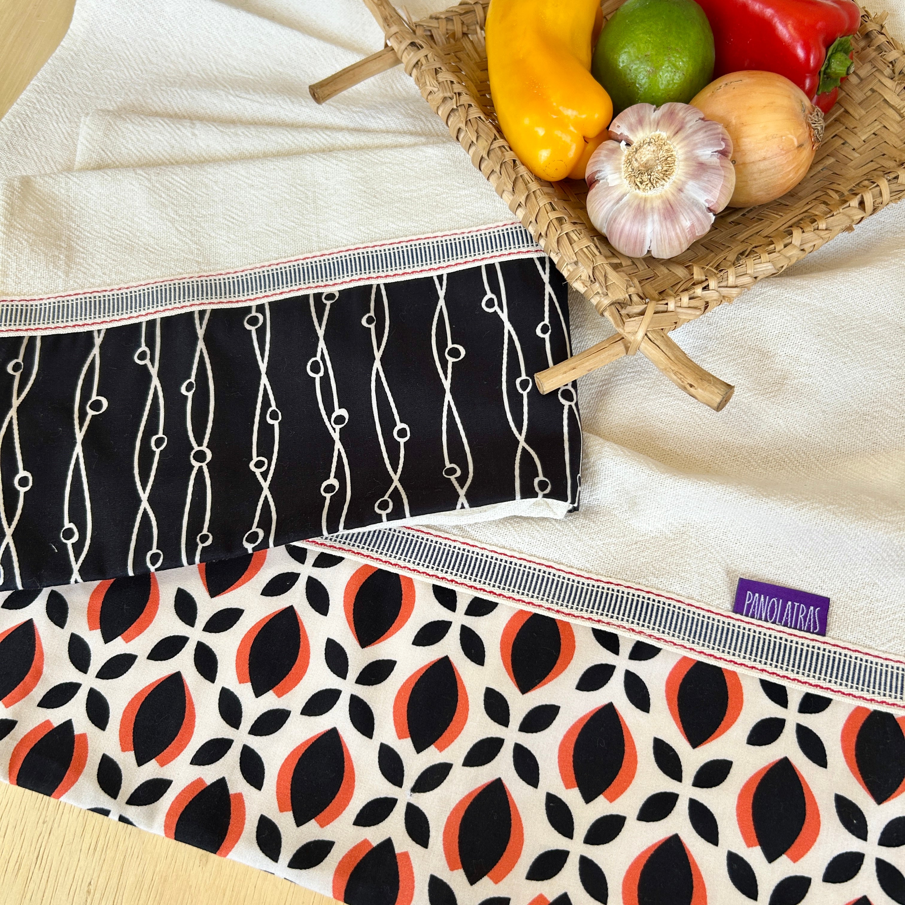 O tom cru do tecido valoriza o natural e reforça o cuidado na escolha dos materiais. O acabamento em tricoline estampada — também 100% algodão — traz cor e aquele toque moderno e estiloso à peça, com estampas Panólatras que fazem a diferença na cozinha.