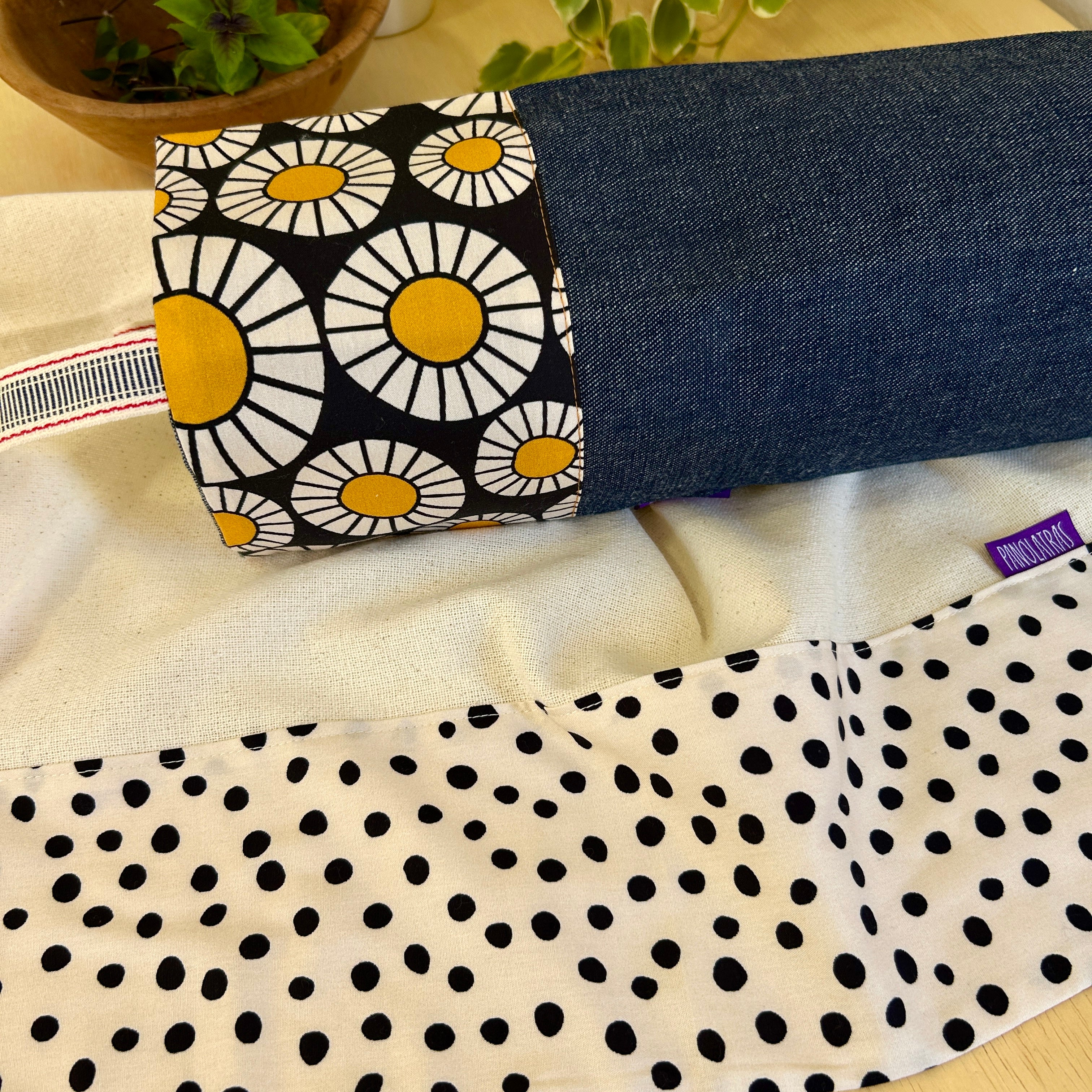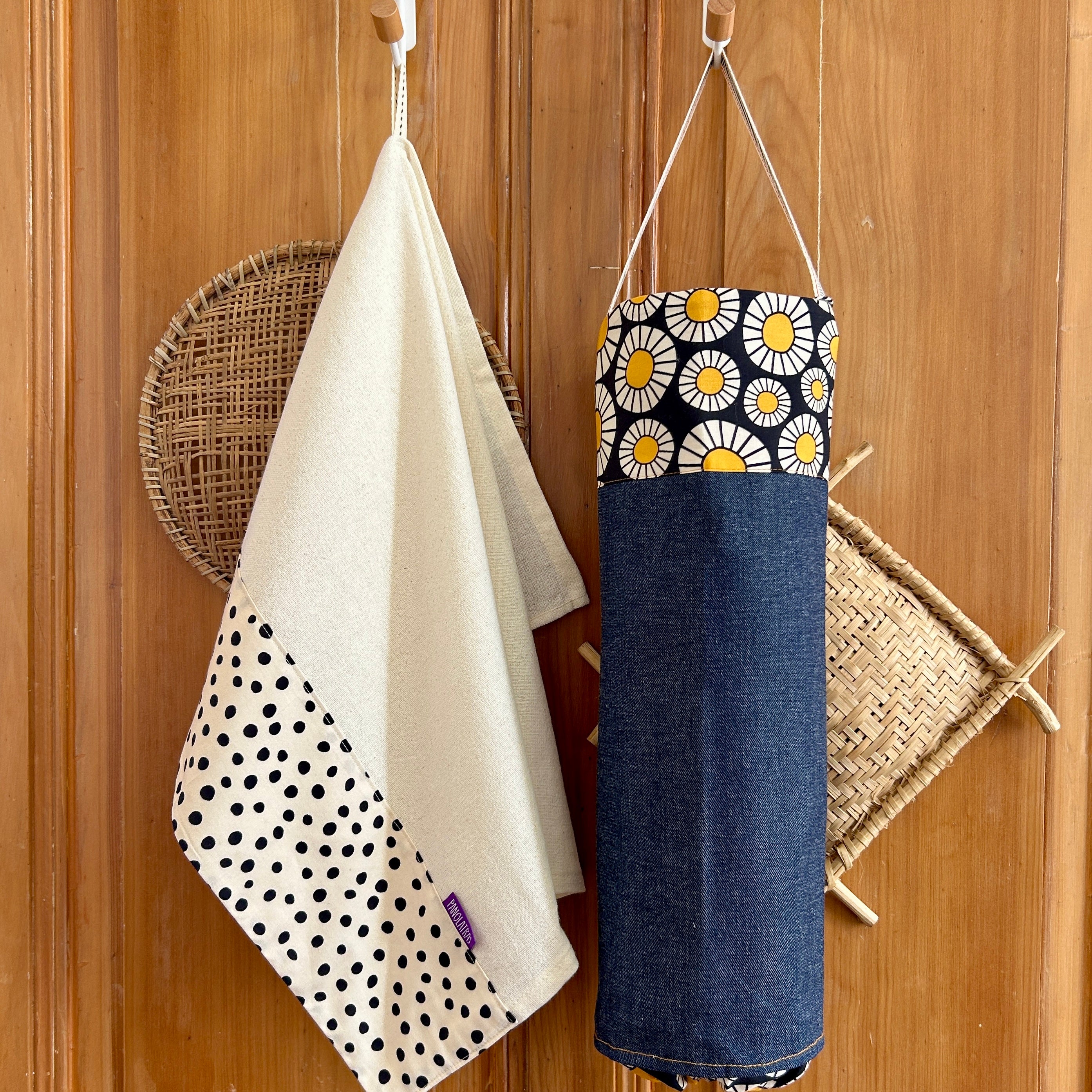 O puxa saco é confeccionado em jeans leve (denim 100% algodão), com barrado em tricoline estampada combinando. Uma peça prática e indispensável para armazenar sacolas plásticas com charme e funcionalidade no dia a dia.