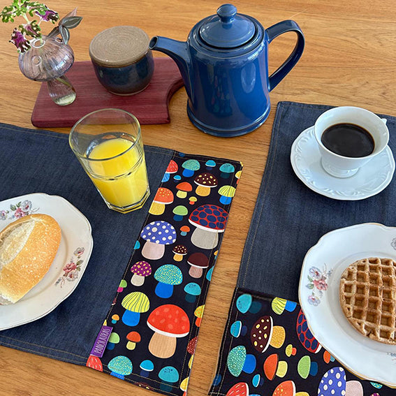 Uma mesa posta com mais cor, estilo e funcionalidade. Nossos jogos americanos são confeccionados em jeans leve e tricoline estampada 100% algodão — com as estampas exclusivas Panólatras que você já conhece.