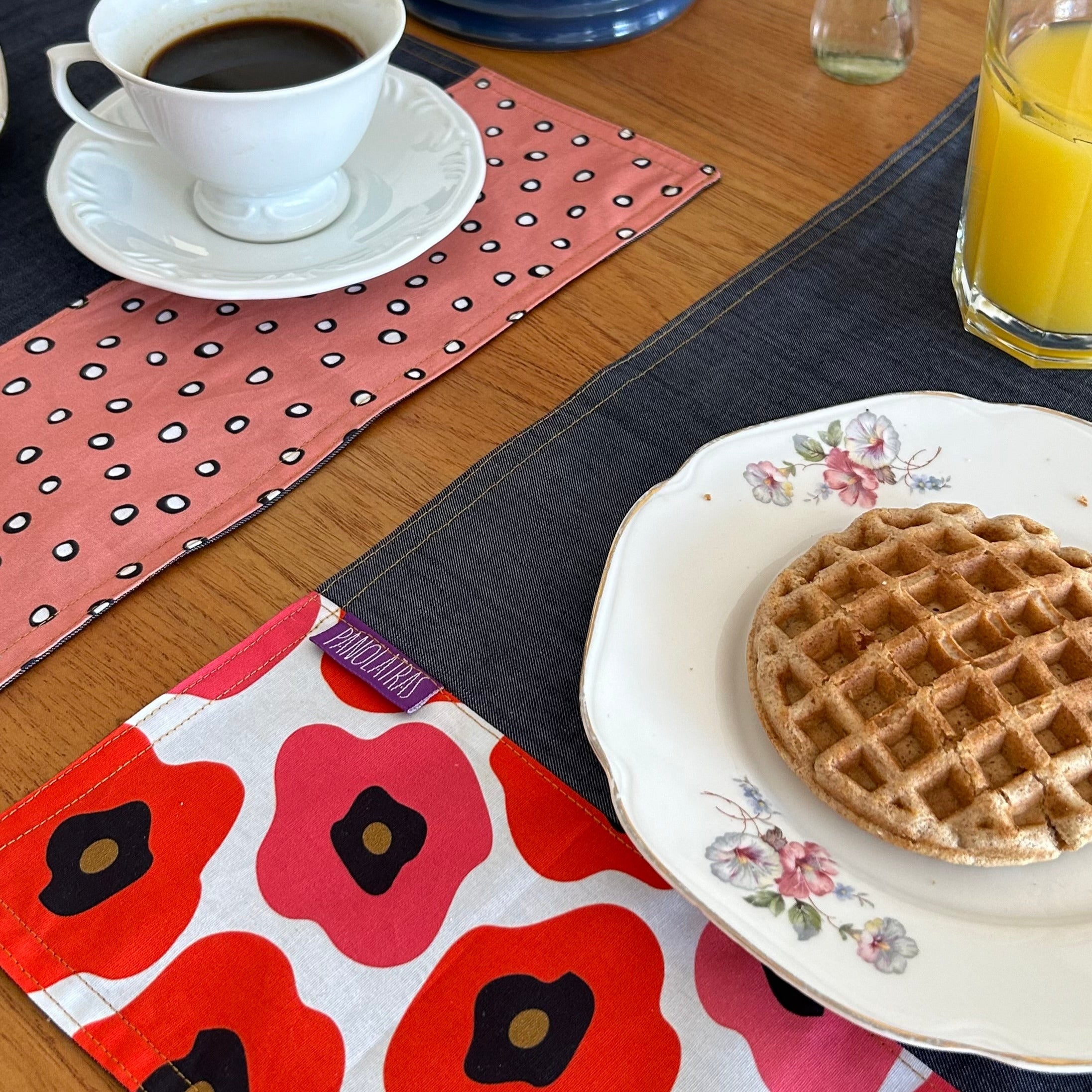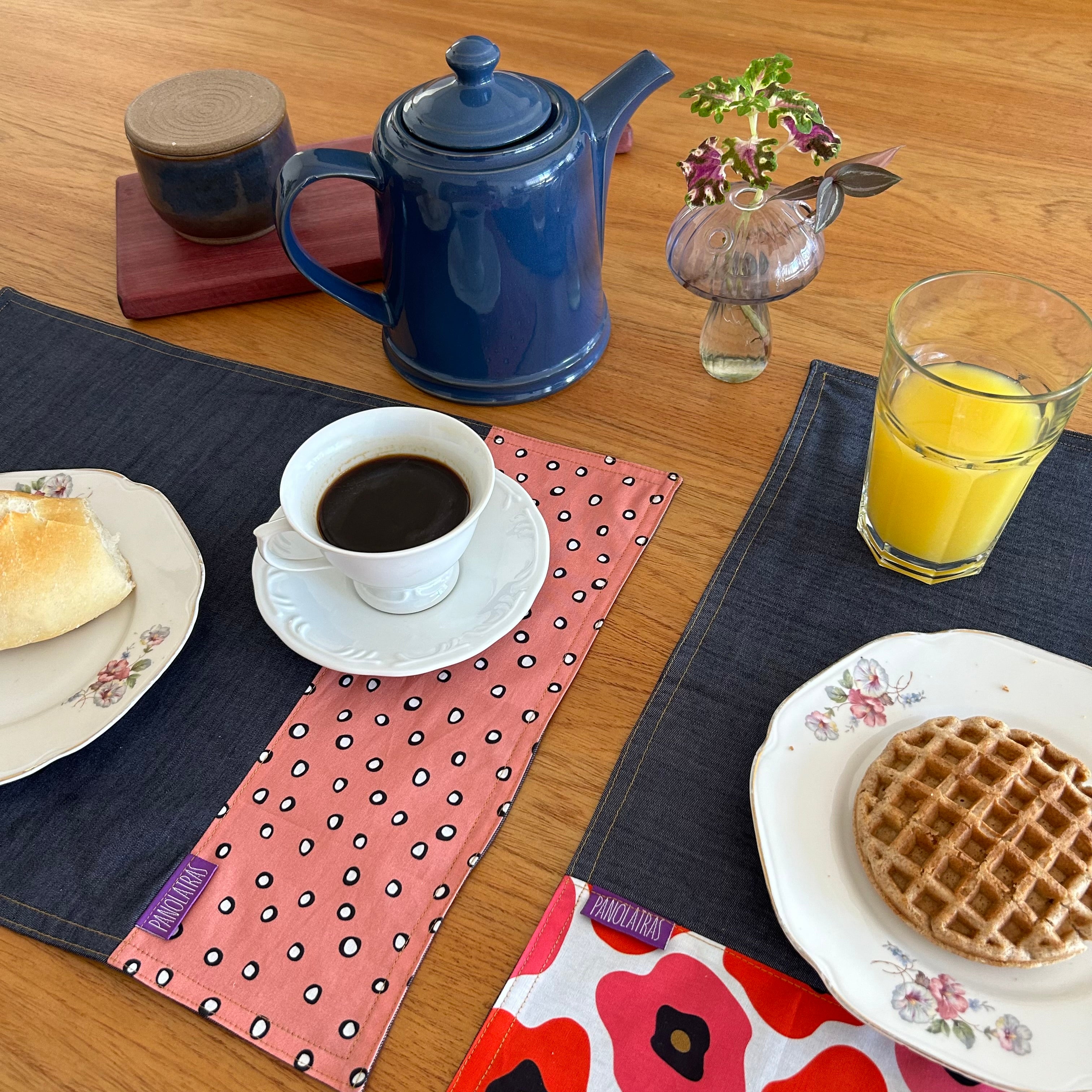 Uma mesa posta com mais cor, estilo e funcionalidade. Nossos jogos americanos são confeccionados em jeans leve e tricoline estampada 100% algodão — com as estampas exclusivas Panólatras que você já conhece.