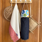 O puxa saco é confeccionado em jeans leve (denim 100% algodão), com barrado em tricoline estampada combinando. Uma peça prática e indispensável para armazenar sacolas plásticas com charme e funcionalidade no dia a dia.