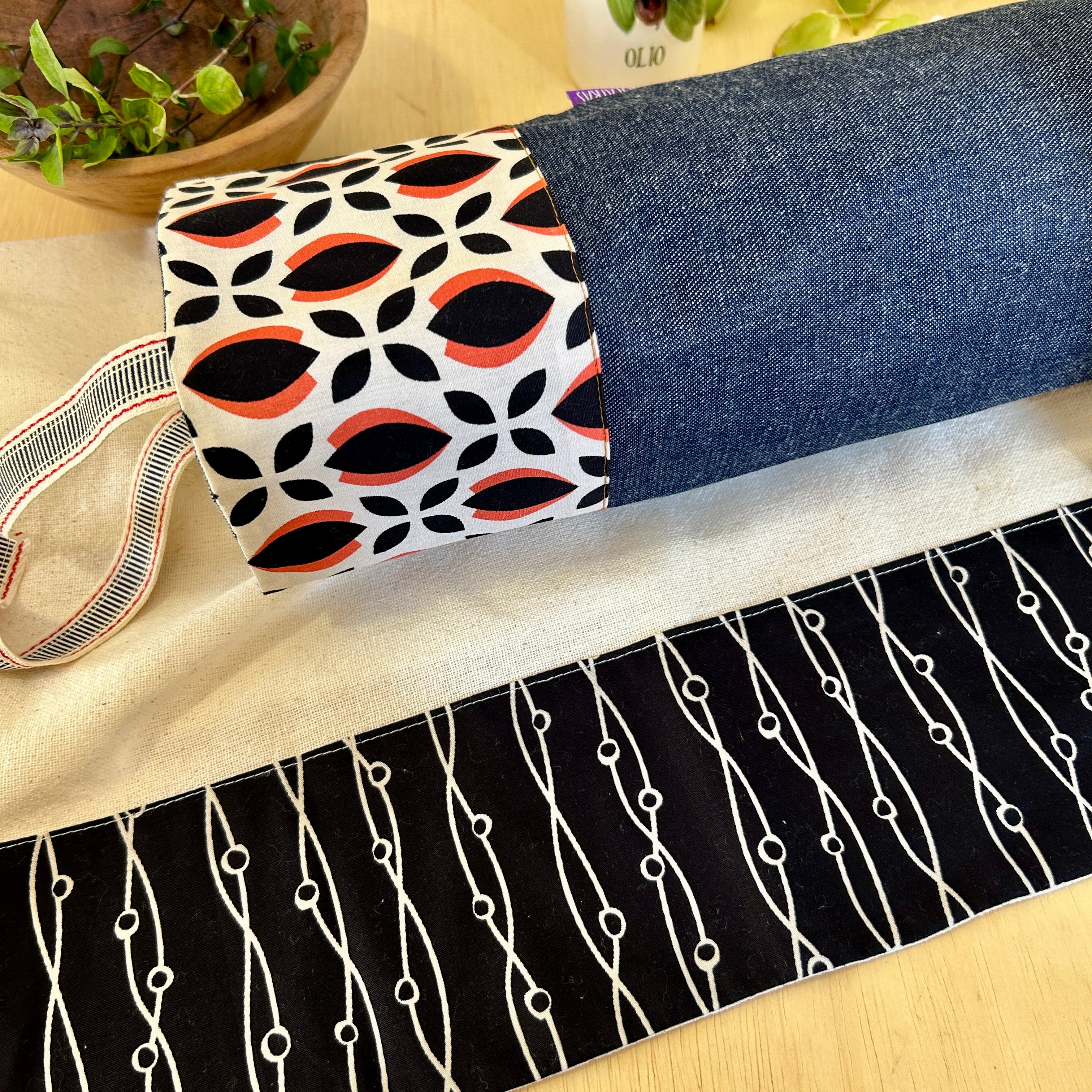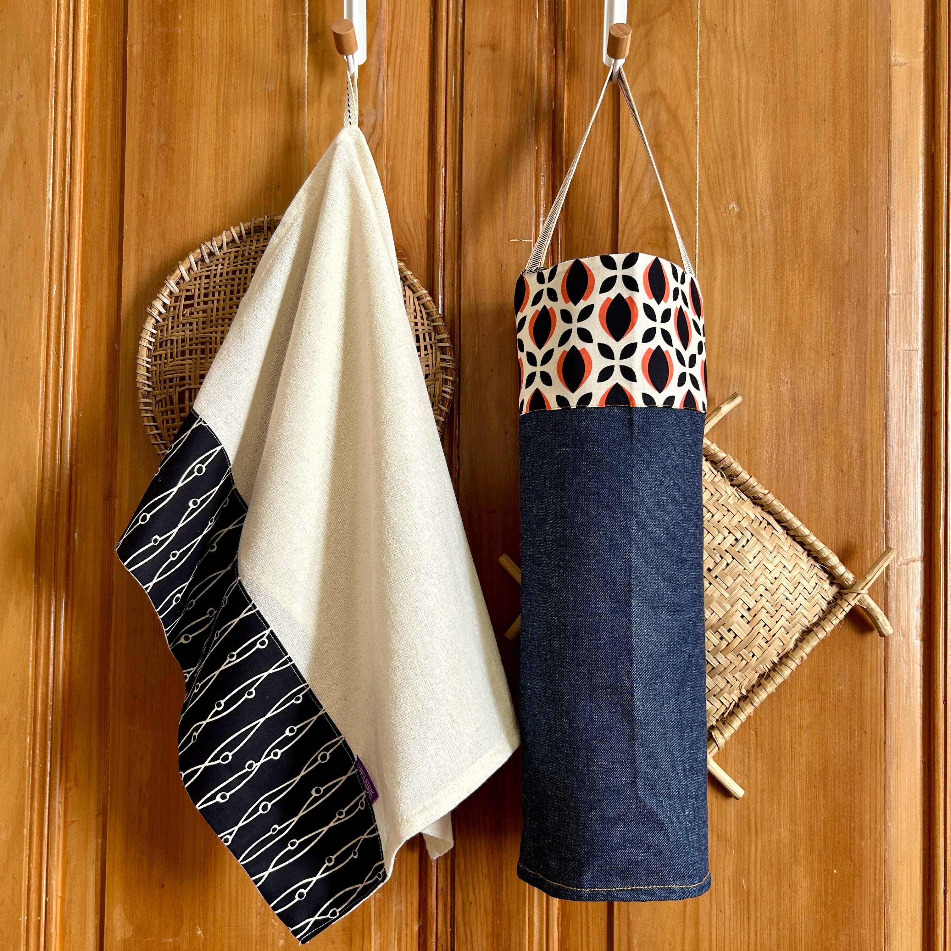O puxa saco é confeccionado em jeans leve (denim 100% algodão), com barrado em tricoline estampada combinando. Uma peça prática e indispensável para armazenar sacolas plásticas com charme e funcionalidade no dia a dia.